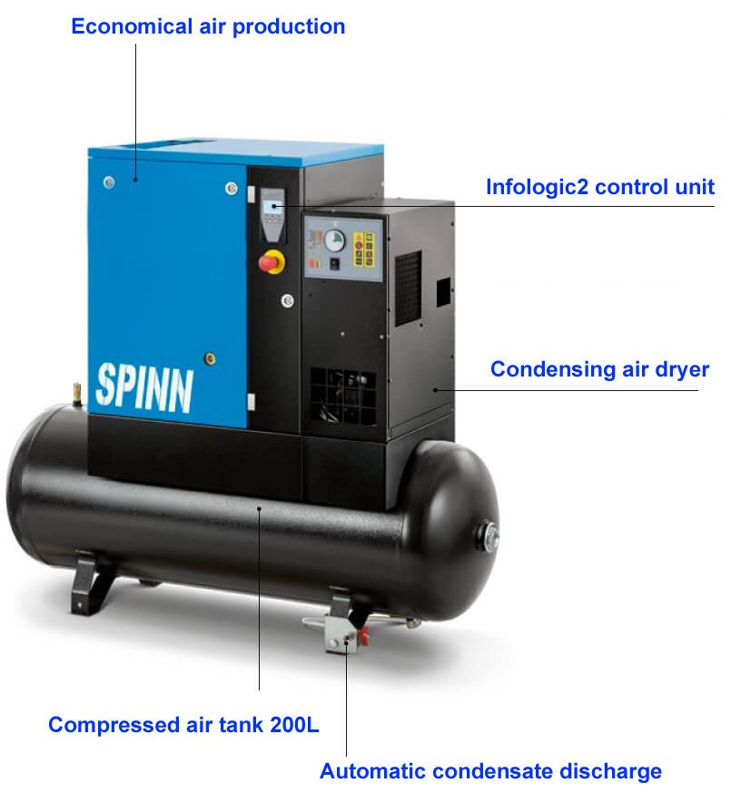 Revolutionary small screw compressor with an input of 5.5 kW in the concept of traditional piston compressors with a pressure vessel of 200 l. The maximum pressure at the outlet is 10 bar at an air flow of 780 l/min. COOL condensing dryer with dew point +5 °C, electronic condensate discharge and digital PDP-display. Simple maintenance after removing the cover. Suitable for constant intake of compressed air with up to 30% energy savings.