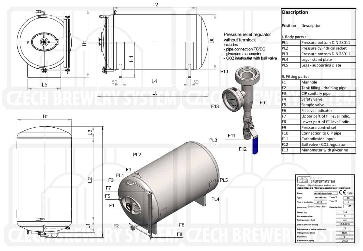 - Medium-pressure cylindrical vessel 300 liters – The maximum available overpressure is 3.0 bar, includes PED certificate for pressure vessels – the container can be used as pressure bright beer tank for tapping of beverages into kegs or bottles, filtration and drafting of beer or cider with manual or automatic fillers.