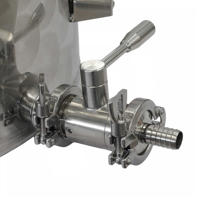 The TriClamp 1.5″ (50.5mm) product discharge neck, TriClamp ball valve and the optional 20mm hose barb allows you to connect either any 3/4″ simple hose or a professional food-standard hose DN32-DN40 (with TriClamp 1.5″ couplers) on the discharge outlet.