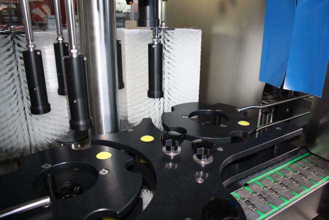 The washing station (rotating carousel with 6 bottle-platforms) performs the washing of the external surface of the bottles. The washing action of the body is achieved thanks to 4 external brushes.