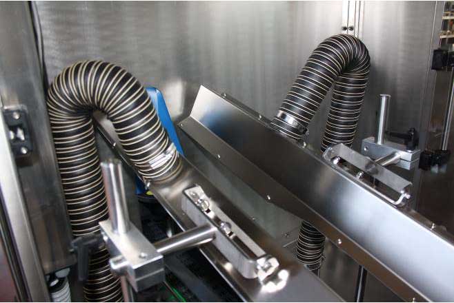 The drying station (linear section) dries the bottles by means of two blowing pipes (adjustable to fit different bottles) feeding hot air on the entire external bottle surface. The blown air is always in temperature about 25/30°C higher than the ambient environment.