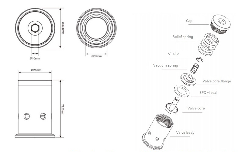 Safety pressure-vacuum relief valve for pressure tanks for vacuum of 0.05 bar and pressure of 2.5 bar. Connection : TriClamp DN40 D=50.5mm .