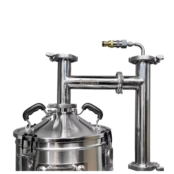 The steam condenser kit connects to an existing glass or stainless steel Brewzilla brewhouse lid with a 2″ Tri-Clamp grommet (with a disc diameter of 64 mm) or directly to a distillation lid with this connection.