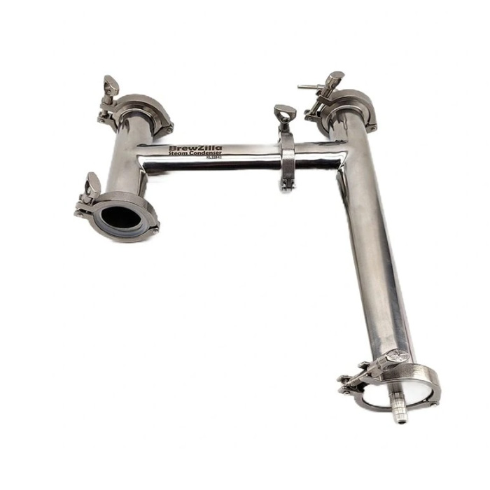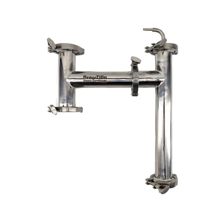 The steam condenser is an optional accessory for Brewzilla brewhouses that makes it easier to brew beer indoors without steam and condensation. The stainless steel steam condenser converts waste steam back to liquid and discharges it into a collection container or duct – without the need to install a fume hood.