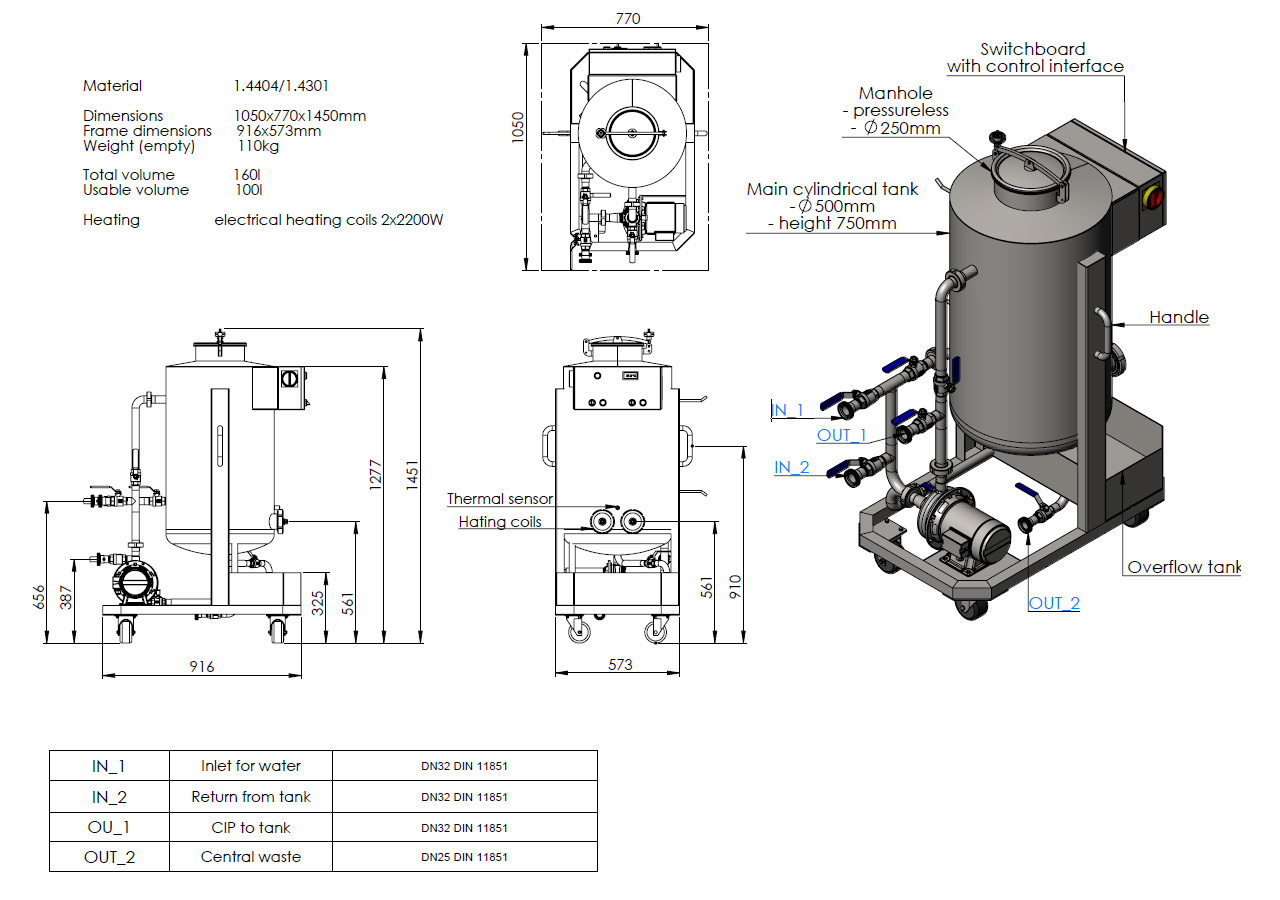 The CIP consists of one main tank for alkaline or acid solution and one vessel used for a neutralization of the solutions. The circulation of the sanitary solutions is provided by a pump and a system of connecting hoses.