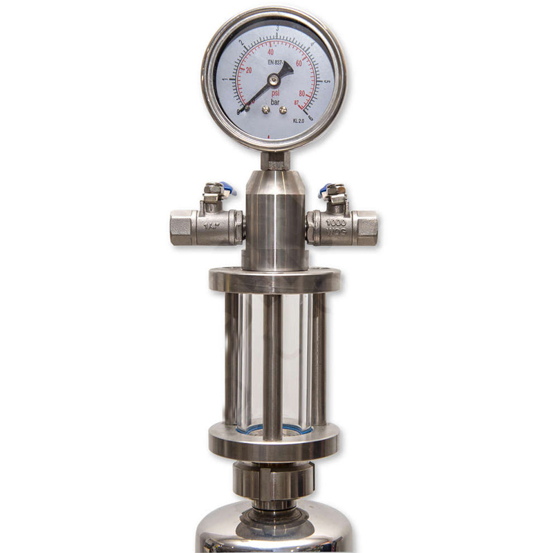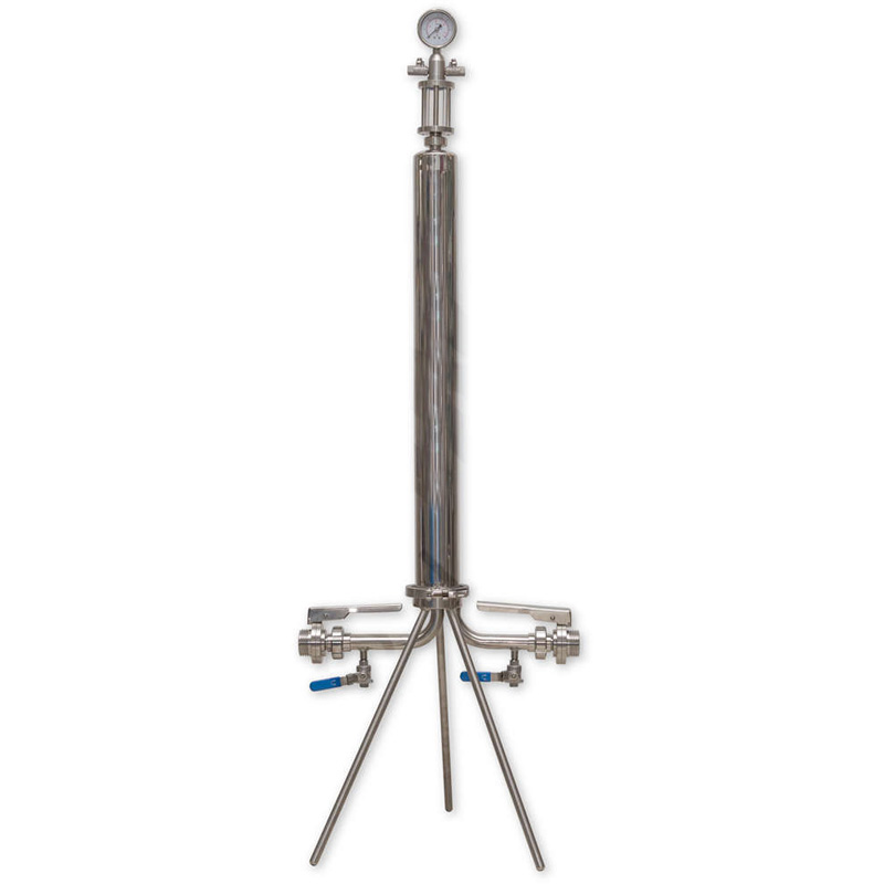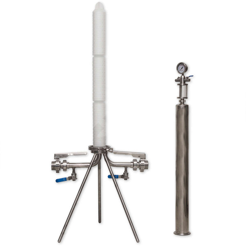 Stainless steel filter housing for a single 30/3″ filtration candle element is a tool used in the pre-bottling stage of a beverage production process.