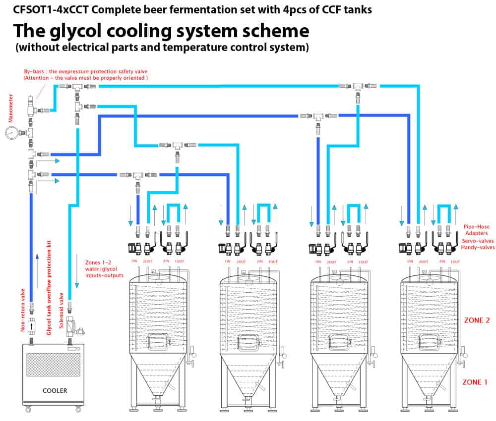 The example glycol tank cooling system with the CWC-CMC manifolds and 4 pcs of cooled tanks :