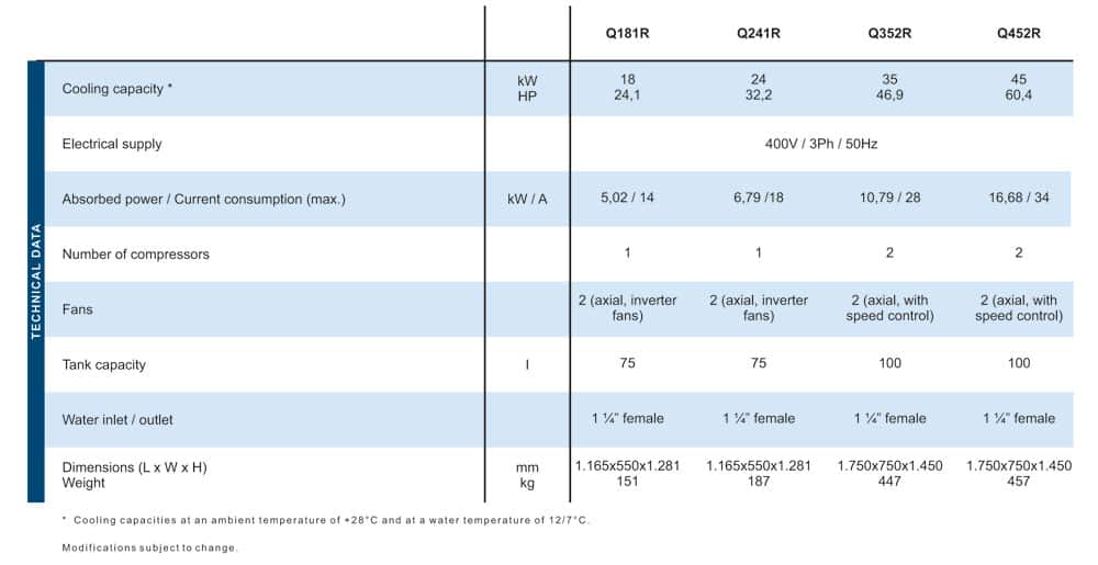 The units are designated to be placed outdoors for operation between environment temperatures from -10°C to +45°C. The rated cold-water temperature is between -10°C and +18°C, (warm water up to +50°C in reverse mode). Model-sizes are available with cooling capacities from 18 kW* (Q181R) to 45 kW* (Q452R).