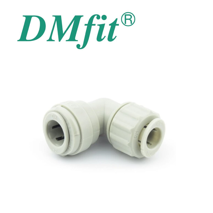 Angle plastic L-coupler for quick connection of one hose (flexible pipe) with outer diameter of 9.5 mm (3/8″) and one hard pipe with outer diameter of 6.0 mm (1/4″).