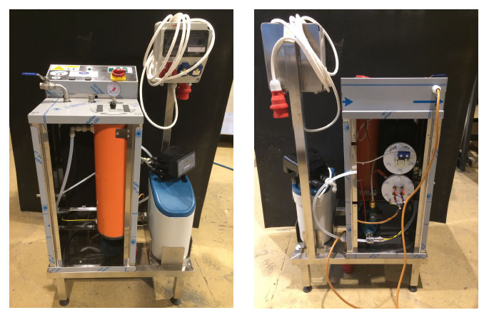 with power capacity of 15 kW (up to 19.8 kg of hot steam per hour), steam pressure from 0.5 up to 3.5 – 7.0 bar (depending on version), the compact solution of the steam generator and the water treatment system on the stainless steel frame, with all connections.