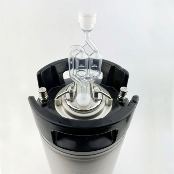 Special lid for a cuvette with the fermentation plug (air lock). This special lid allows you the fermentation of beverages in the slim stainless steel kegs. Compatible with 9 L and 19 L cuvettes.