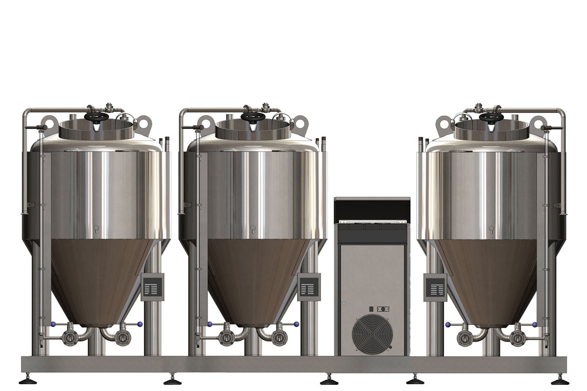with three 200 lt / 240 lt Cylindrical-conical tanks (CCT) with classic design, insulated, double-jacket, cooled by water/glycol, adjustable pressure from 0bar to 3bar
