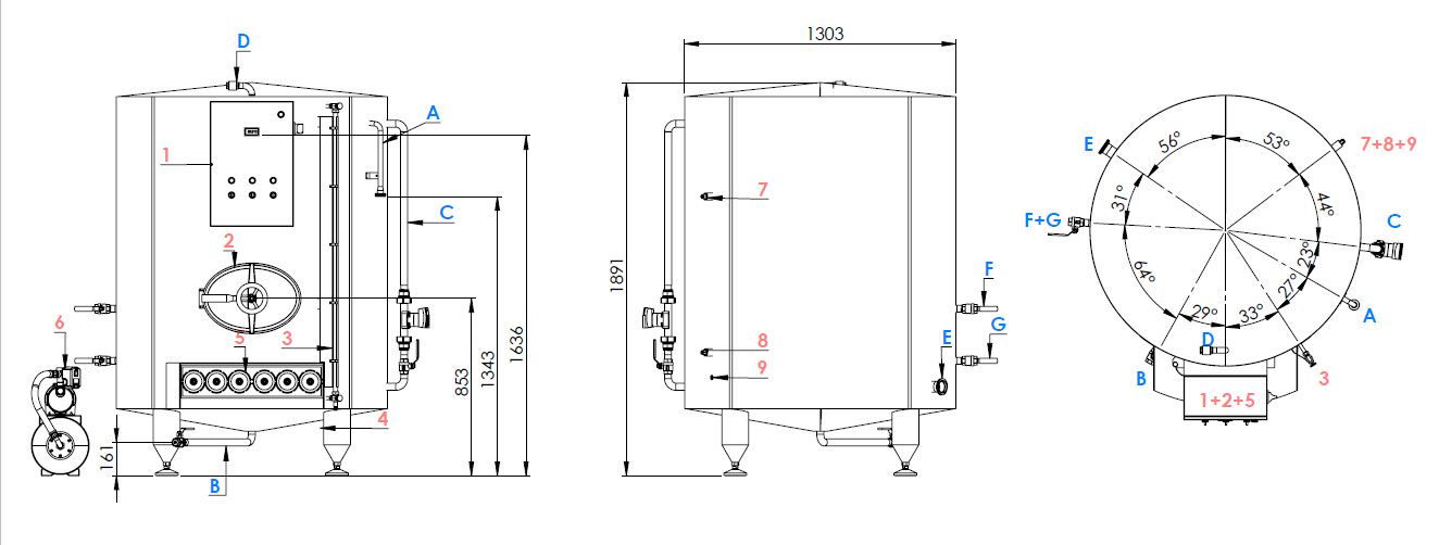 The hot water tank HWT-1500 (boiler) is equipped with a water pumping unit. It is designed for storage of 1500 liters preheated water from the first cooling stage and following heating up to 80°C. The container is made of material AISI 316L, DIN 17 349, AKV extra 2.