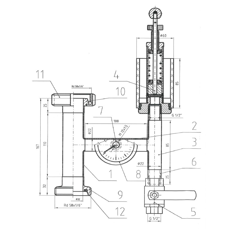 MTS-RV2-DN32DC Pressure adjusting apparatus type 6 with manometer and air-lock for fermentors DN32 DC is an extension equipment to the monitoring of current pressure and setting of required pressure in the tank. Also the fermentation lock is included in this part to visual monitoring of the fermenting process in the tank. Connection : Upper connection (to CS2 pipe) DIN 11851 Dairy Coupling DN 32 / NW 32. Adjustable pressure in the tank from 0bar to 3.0bar using the regulation screw with the spring.