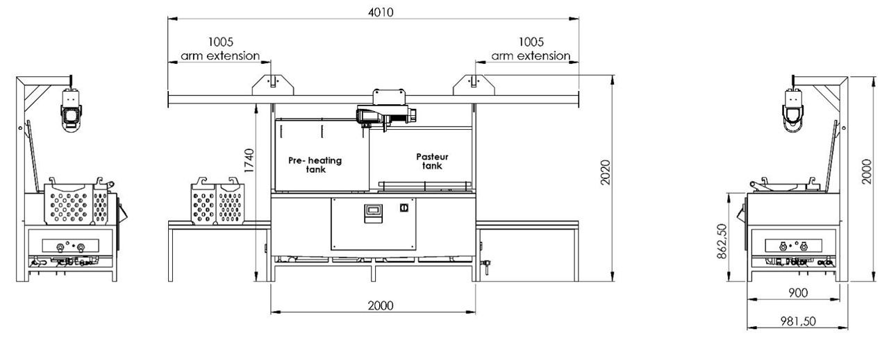 Dimensions of the pasteuriser with two stainless steel tables and the extended crane track (the long version) :