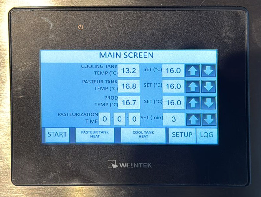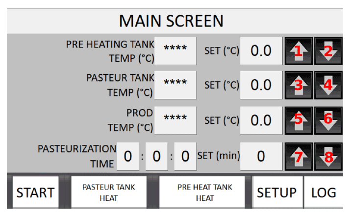 - Press the PASTEUR-TANK HEAT button to start the automatic process of heating the pasteurization water in tank number 2