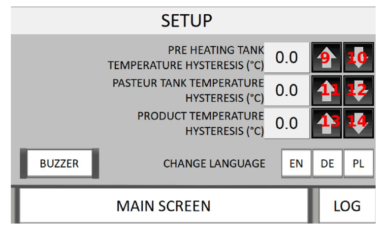 - Use the arrows (11 + 12) to set the hysteresis of the pasteurization water temperature in 0.5 °C steps