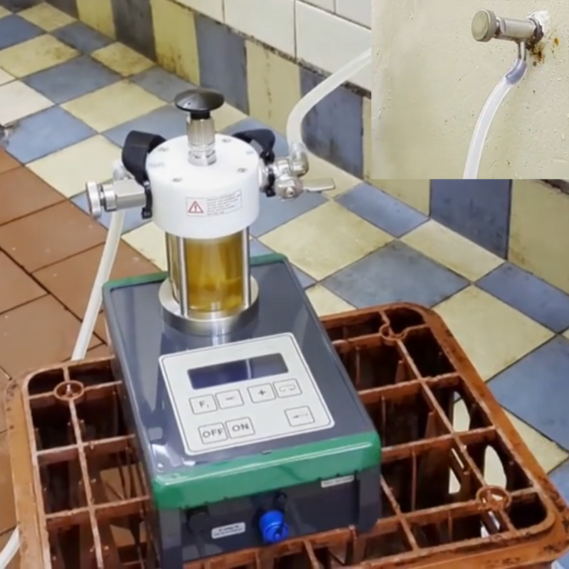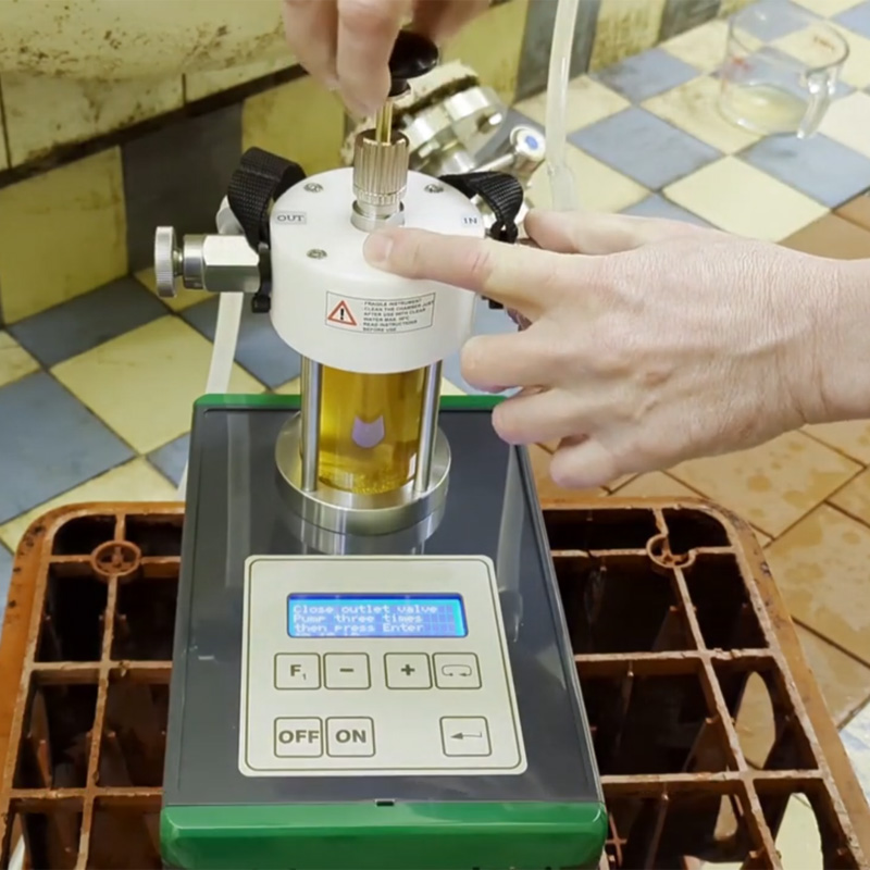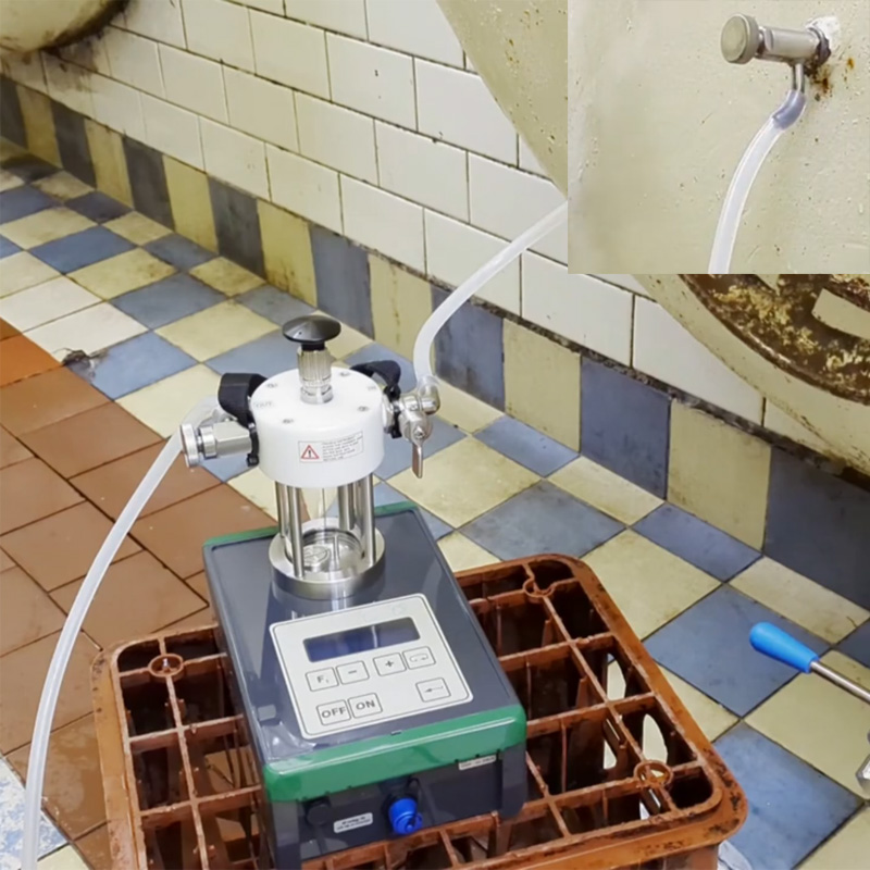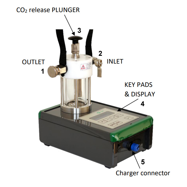 Preceding measurement the operator connects the device (using a rubber flexible hose) to the pressure beverage storage tank or the fermenter or to a special adapted head for a keg. The optional special head makes it possible to attain a necessary overpressure in the KEG cask securing sample withdrawal. The operator fills a vessel by measured sample of beverage (using the ball valves). The mechanical releasing of gas from a beverage is made by repeated movement of the plunger. After attaining a balance the operator can simply read the balance value of the pressure and the temperature. CO2 content can be read on the display. You can modify the formula for the calculation of the CO2 content in specific drinks.