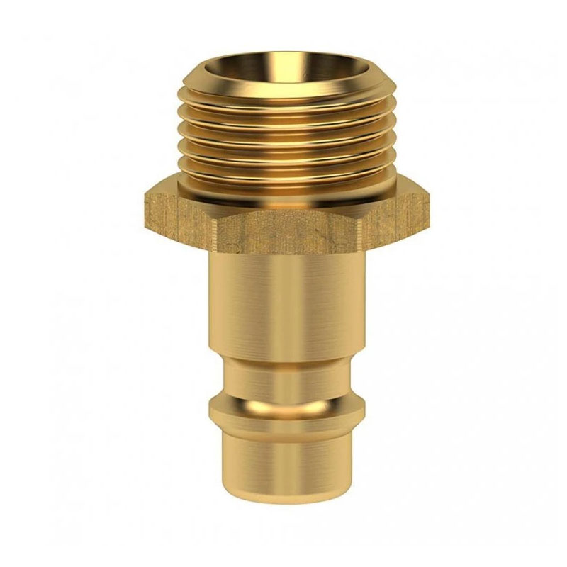 ES quick coupling DN7.2 (male – mandrel) with BSP pipe thread 3/4″ (male). Made of nickel-plated brass MS 58 with one-sided closable check valve. New mandrel contour for better seating of the counterpart and easier assembly. Primarily intended for compressed air in industry and trade – most air compressors are equipped with a counterpart compatible with this coupling. This coupling can also be used for water and other media. Maximum air flow 1,100 l/min.
