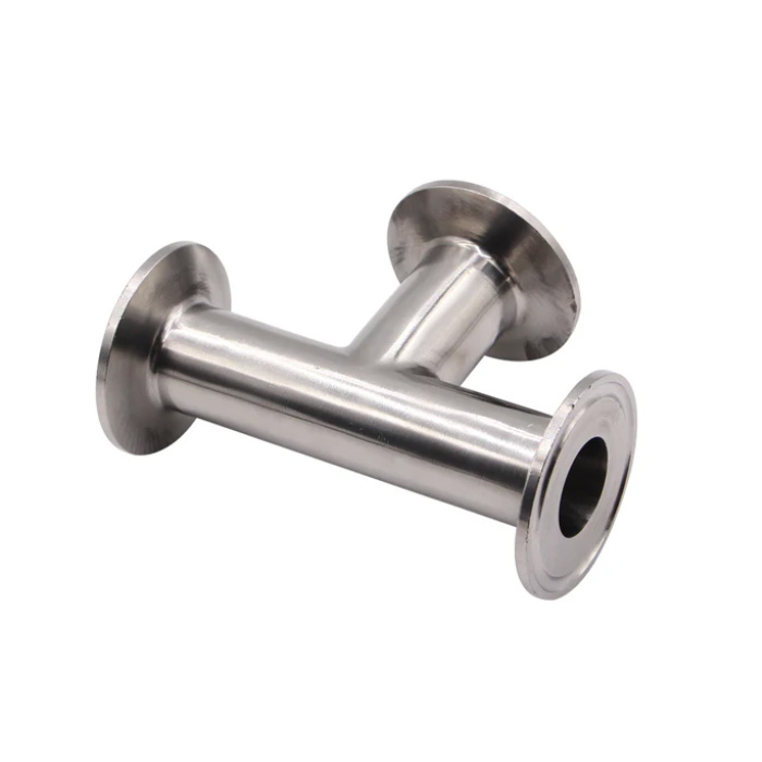 Stainless steel 3-way pipe manifold (T-connector) with three TriClamp connections.