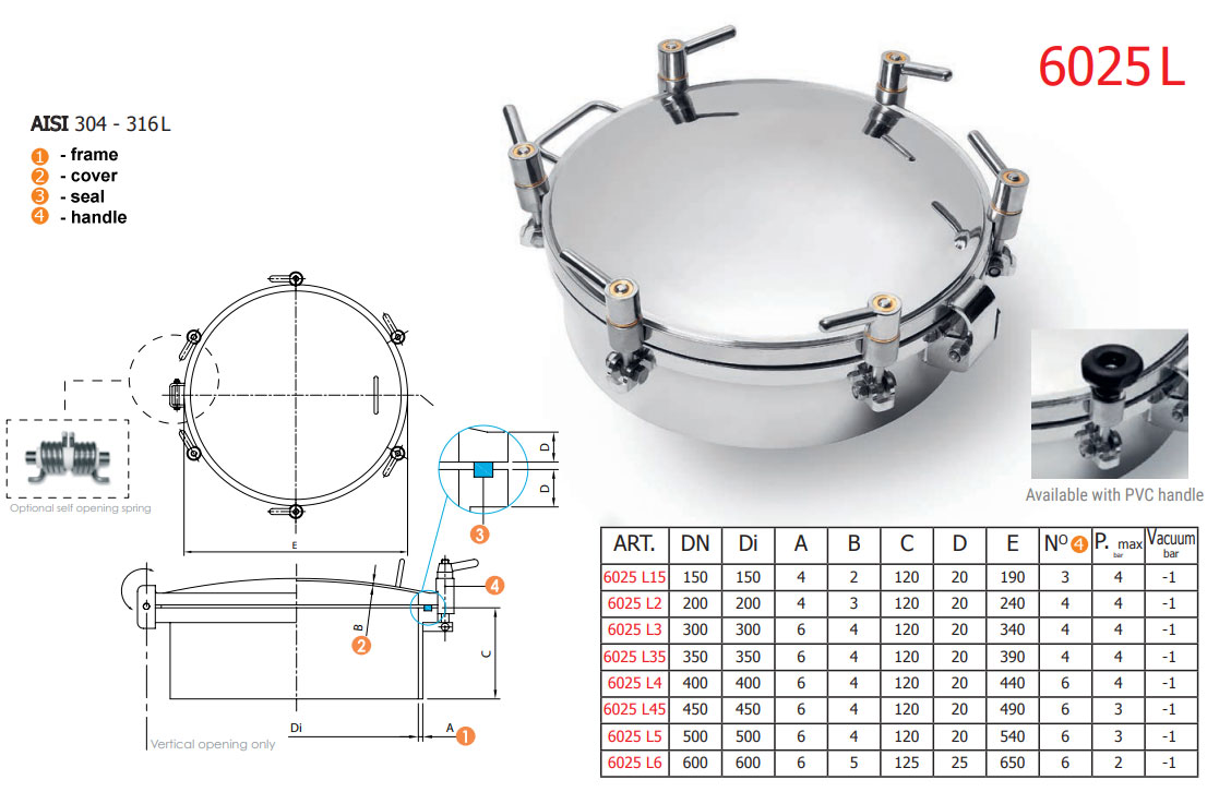 Stainless steel round manhole DN400 with insulated lid / Material : AISI 304 / Pressure 4.0 bar