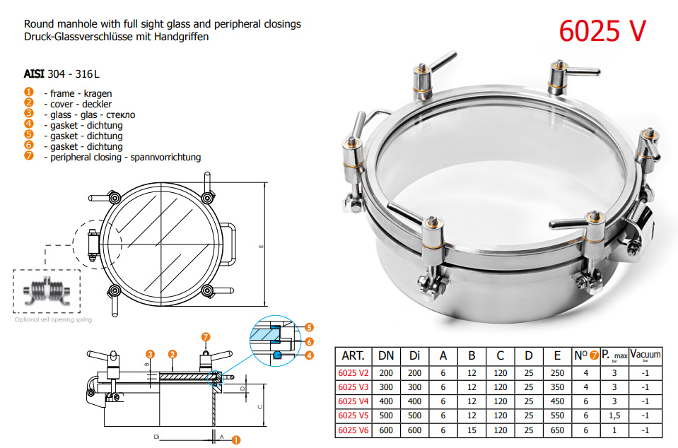 Round manhole DN400 with full glass door – maximal allowed pressure of +3 bar / -1 bar (PED certificate). Material : AISI 304 or AISI 316L.