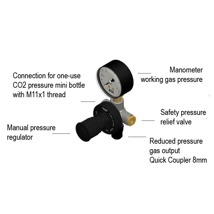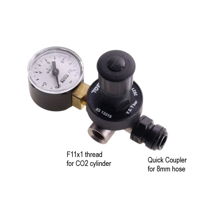 Gas Regulator CO2 TOF mini, with Quick Coupler for 8mm hose (5/16″). The TOF Mini pressure reducing valve is designed for ease of use and reliable performance. This reduce valve is compatible with small CO2 pressure cylinders which are equipped with F11x1 thread.