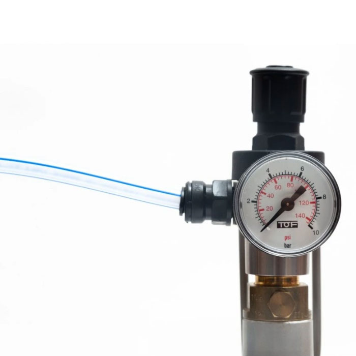 The TOF CO2 pressure reducing valve with the manometer for the Sodastream CO2 pressure cylinders equipped with the outer thread TR21x4 (ACME) is a component needed to measuring, reducing and dosing of pressurized carbon dioxide from Sodastream CO2 pressure cylinders.