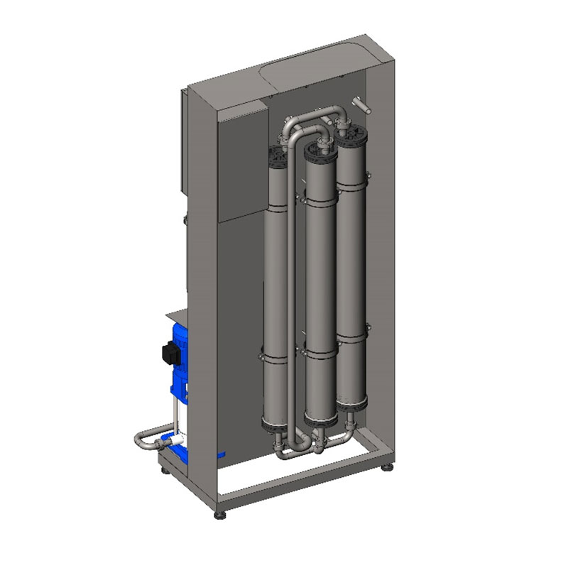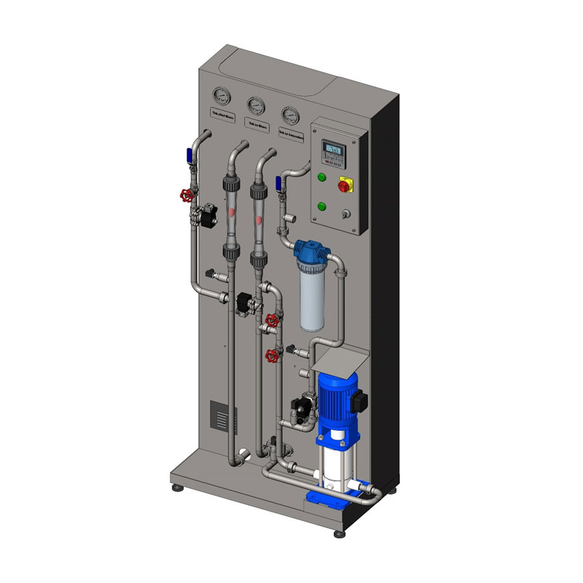 Unlike commonly available units, the WTRO-1000 measures the input and output conductivity of the water and the operator can increase the conductivity of the permeate by mixing in concentrate using precise regulation. For the reverse osmosis unit to function properly, it is necessary to install a water treatment plant upstream of the system, which will remove iron from the water and soften it.