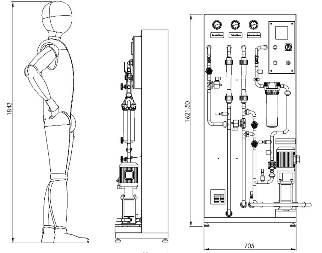 The floor plan dimensions of the WTRO-1000 reverse osmosis unit are 705x400mm with a height of 1621mm. The unit is mounted on height-adjustable feet that eliminate floor slope. The unit can be placed in the production area against the wall, with all serviceability only from the front side. In the case of membrane replacement or service of the connecting pipe, it is necessary to access the unit from the rear.
