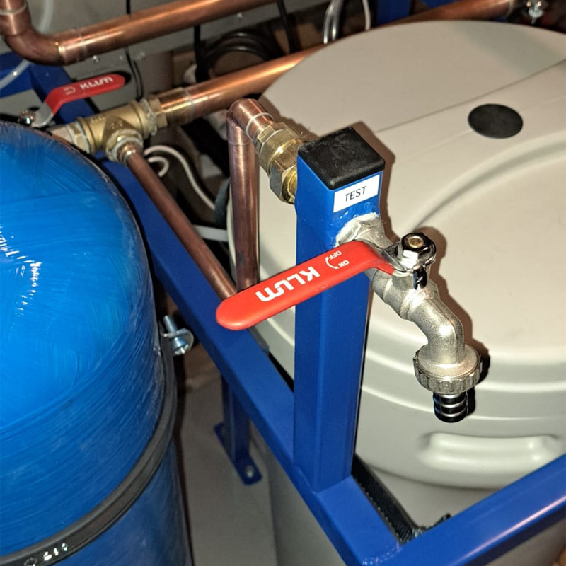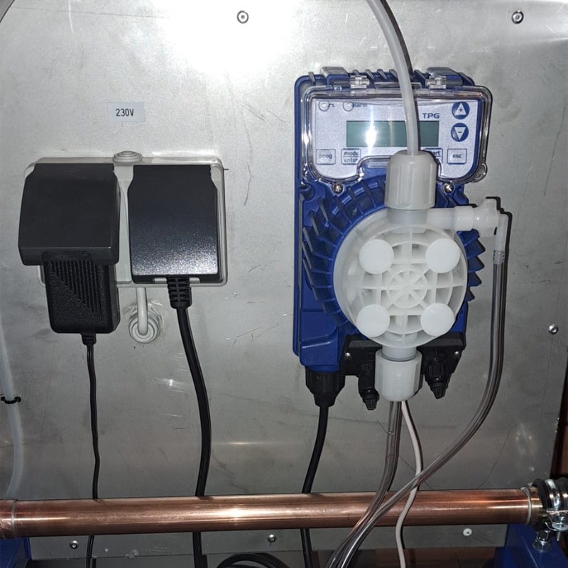 The control unit of the double water softener automatically switches the operation to the second one when the capacity of the first filter is exhausted, while the first one regenerates, and thus the automatic water treatment plant is able to treat the water continuously. The task of the operator is only occasional addition of regenerating salt and chemicals to the tanks. At the moment of refilling the system, the exact amount of mixed chemical from the plastic container is dosed into the flowing softened water by the electromagnetic diaphragm pump. The mixed chemical ensures the correction of pH, alkalinity, deoxygenation of water and maintenance of the required excess of phosphates.