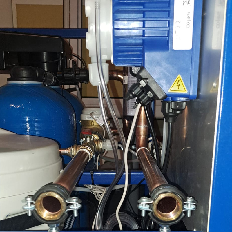 The water treatment plant is equipped with a duplex automatic softener and a dosing unit for corrective mixed chemicals from the storage tank.
